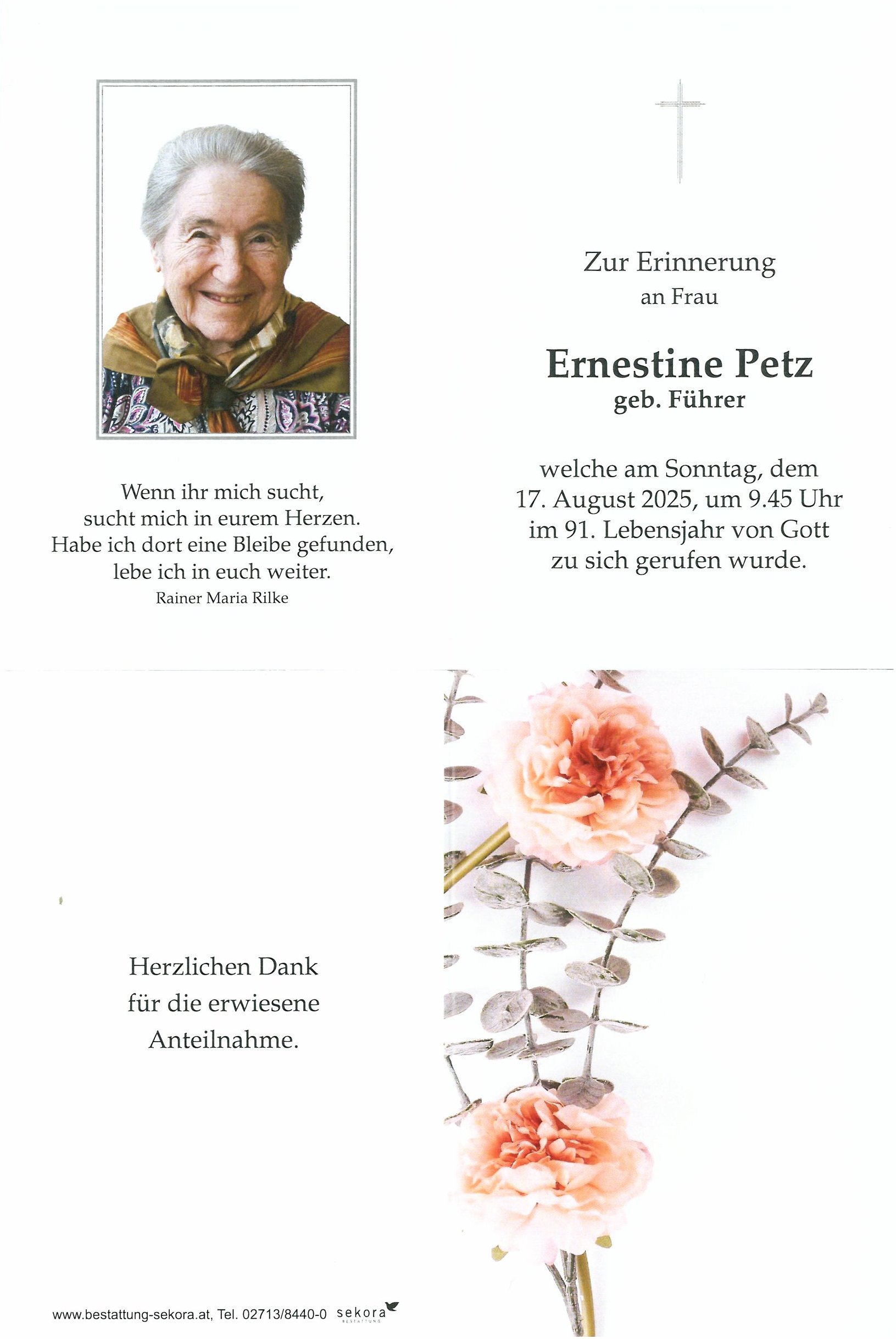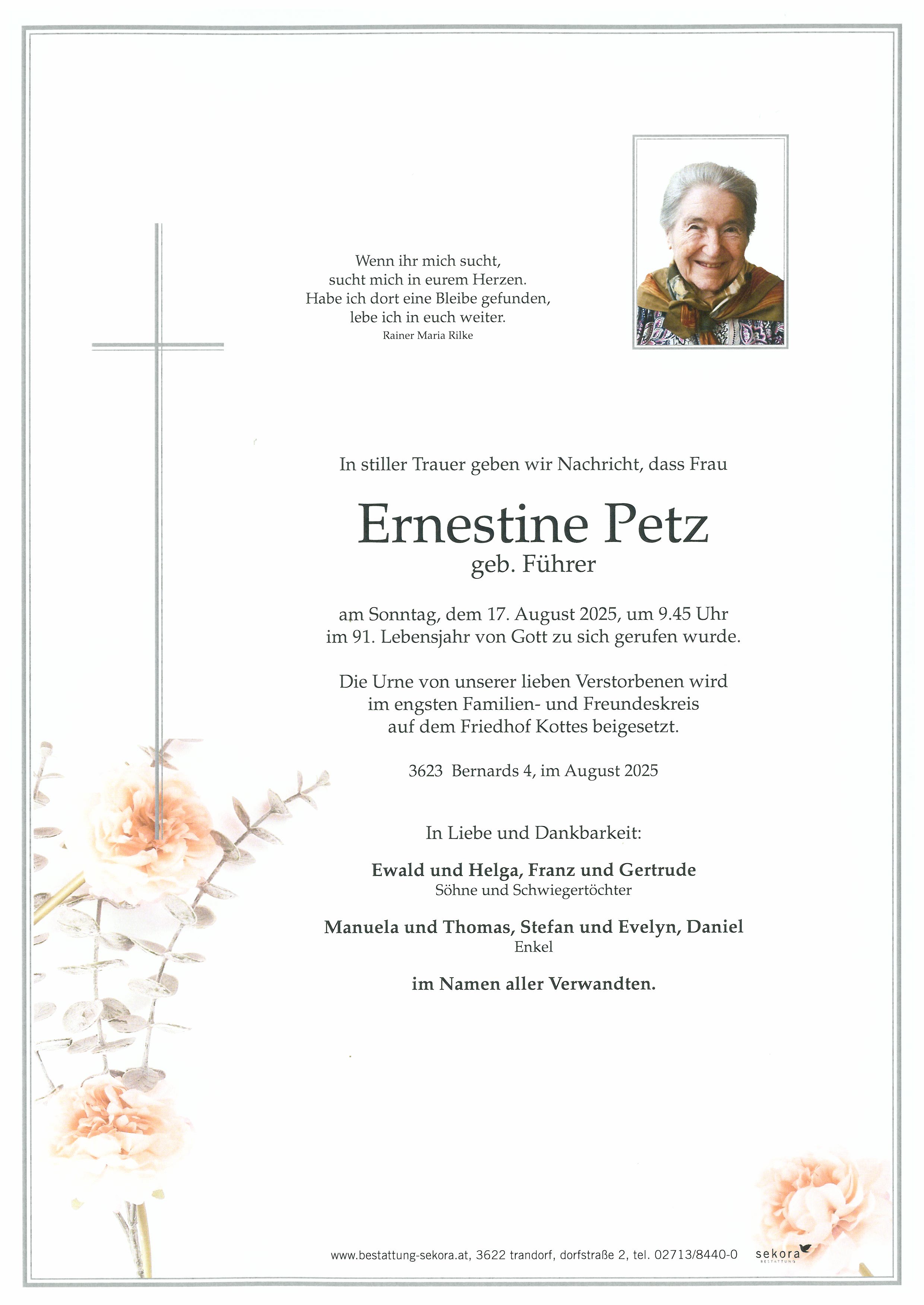 Liebe Trauerfamilie! Was im Herzen liebevolle Erinnerung hinterlässt und unsere Seele berührt, kann weder vergessen werden, noch verloren gehen. Ruhen Sie in Frieden, liebe Frau Petz! Josef Bogner und das Team des Pflegezentrum Yspertal
