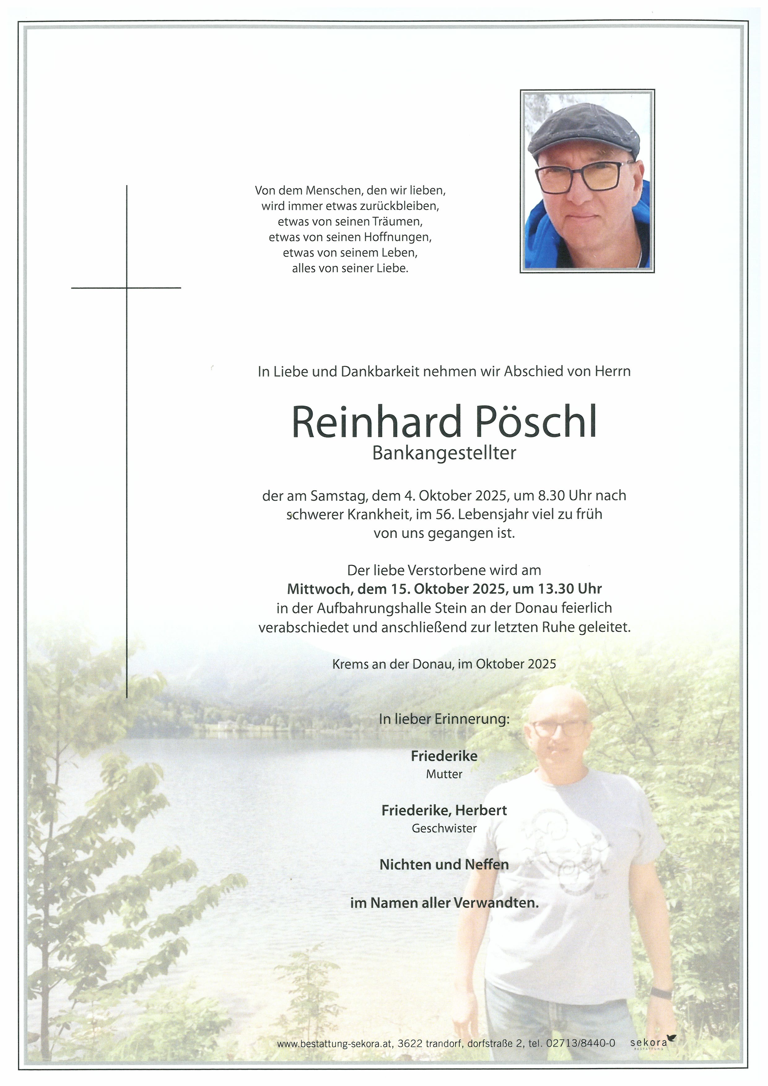 Reini mein Freund, wir haben in den letzten Jahren viele und schöne Reisen gemeinsam unternommen. Neben der großen Trauer bleiben aber die Erinnerungen daran. Die letzte Reise trittst du jetzt alleine an. Machs gut ! ich werde dich vermissen. Mein aufrichtiges Mitgefühl der Trauerfamilie – Thomas Holzer